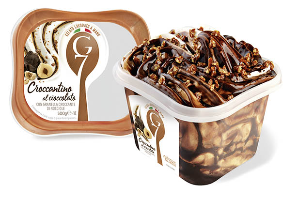 Cream flavoured Gelato with milk and cocoa syrup. Decorated with crispy hazelnut grains.