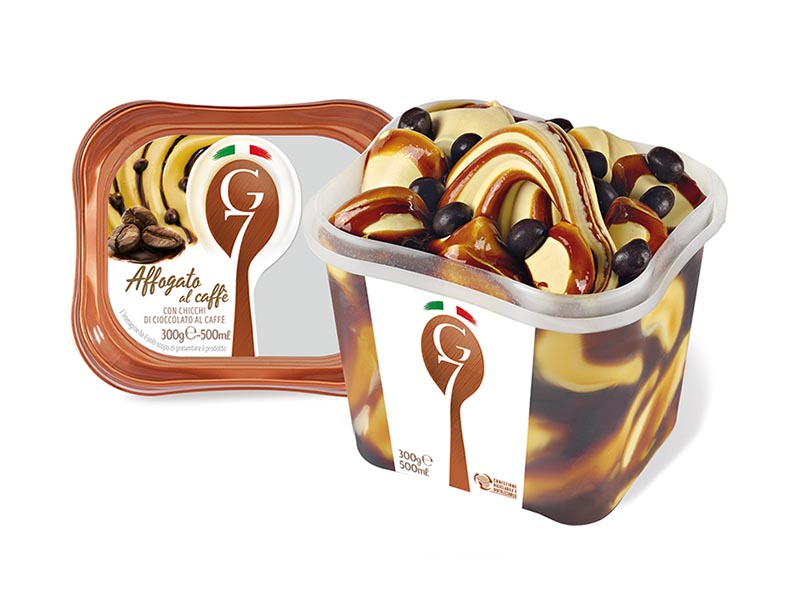 Gelato al gusto di panna, variegato con sciroppo al caffè e decorato con chicchi di cioccolato al caffè.